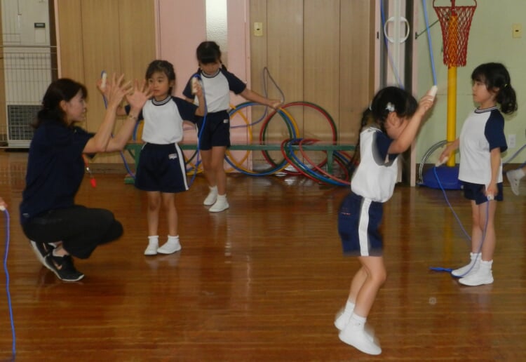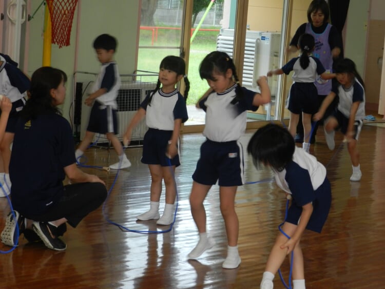 1番目(年長児)さんは体操指導。とっても楽しみにしていました! TANDOU先生と共に縄跳び練習に汗を流しました~。