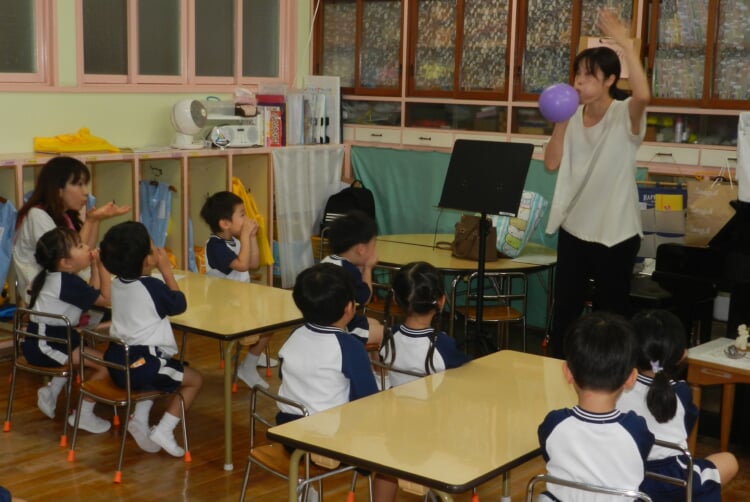 3番目(年少児)・ふたば組(満三歳児)さんは、2グループに分かれてリトミックをMATUNO先生からご指導頂きました。