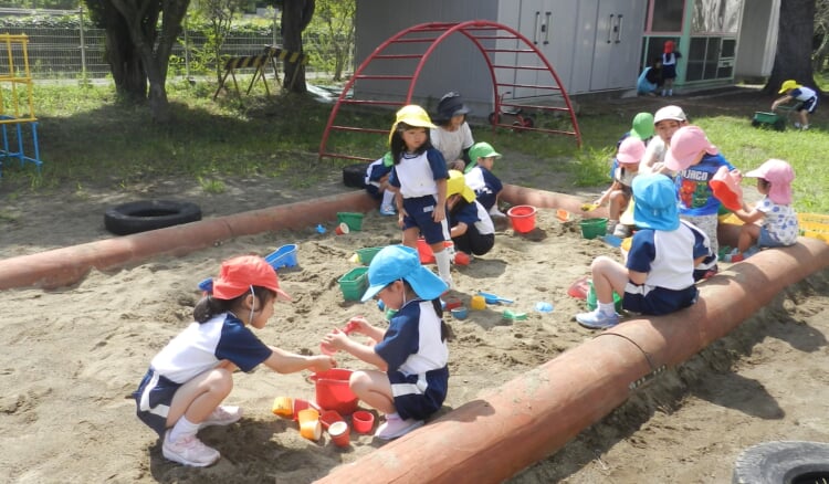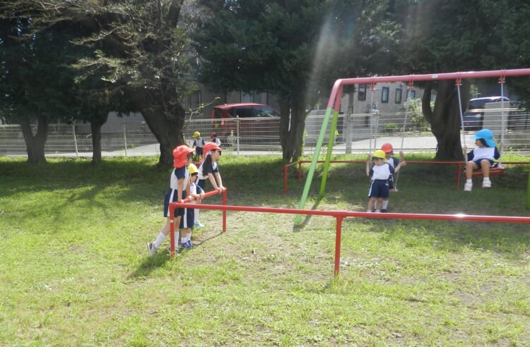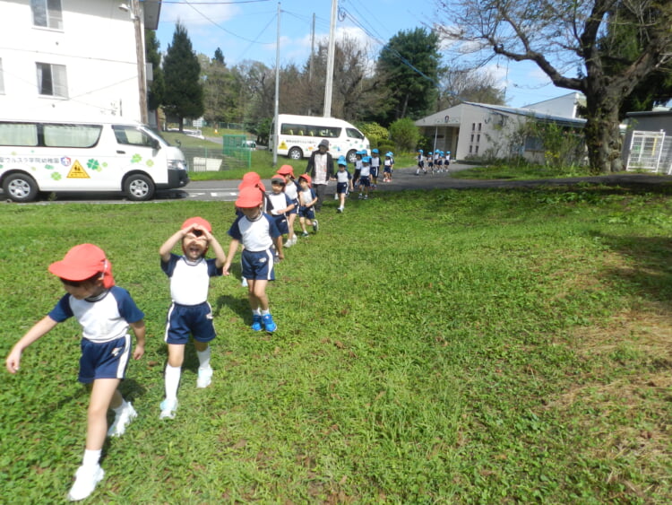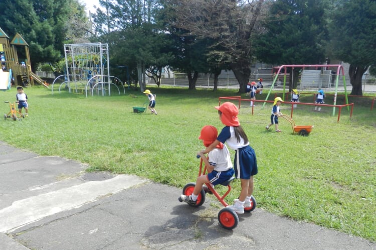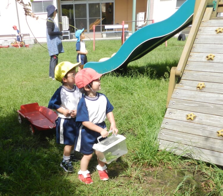 その後は青空の下、三輪車や赤ワゴン、手押し車、お砂場で! トンボやコオロギと! 神様がお創りになった大自然とたっぷり遊びました!!