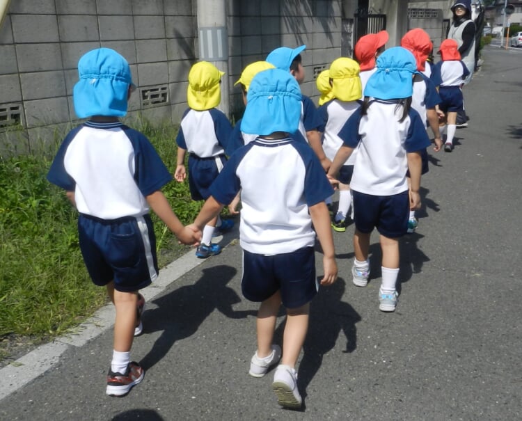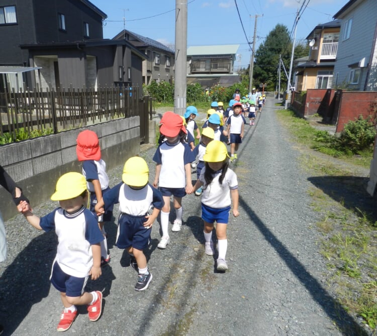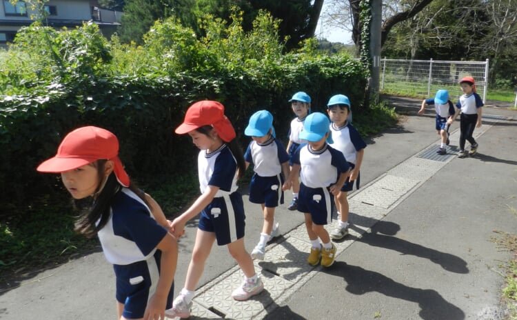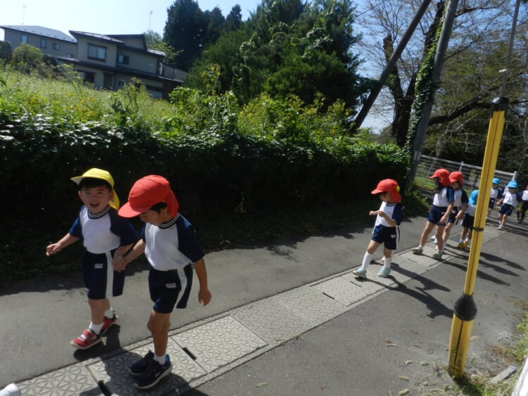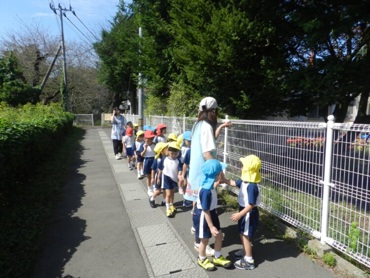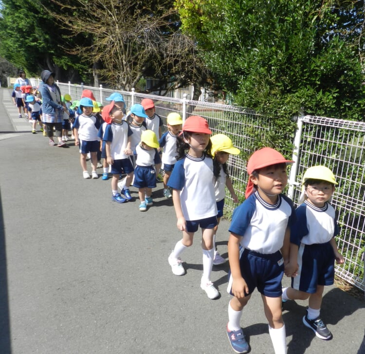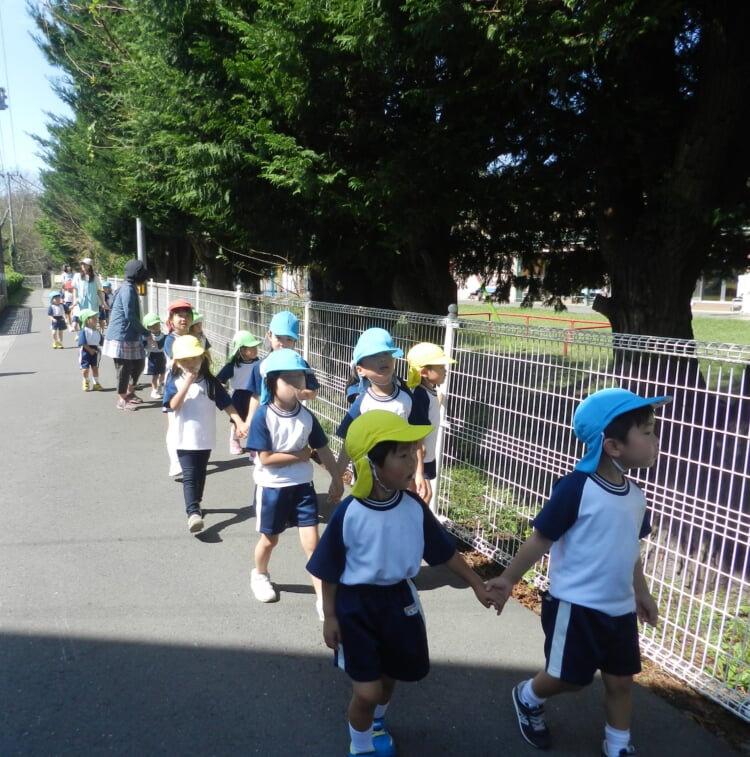 昨年のこの時期は、もう少しお散歩の回数が多かったのですが、暑さ&毛虫対策のため、暫く見合わせていたのです。クラス毎に手を繋いで歩きましょう。