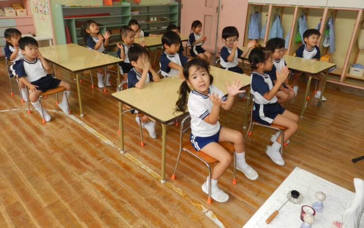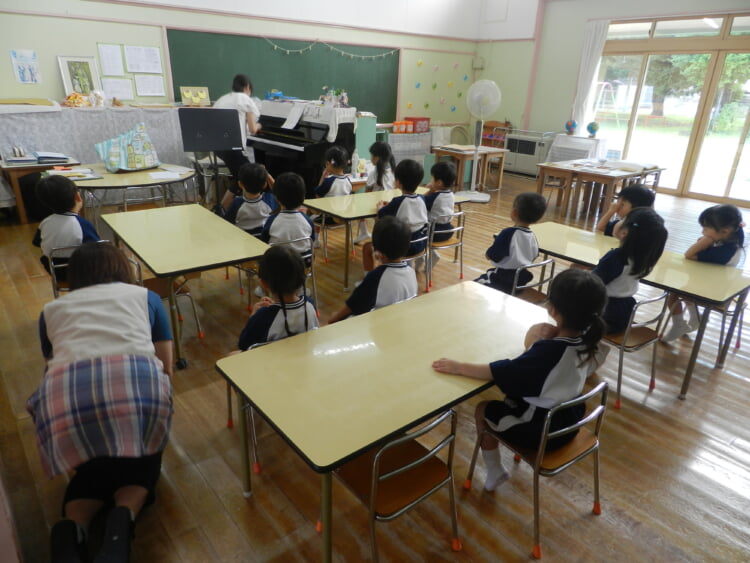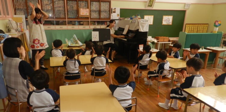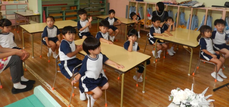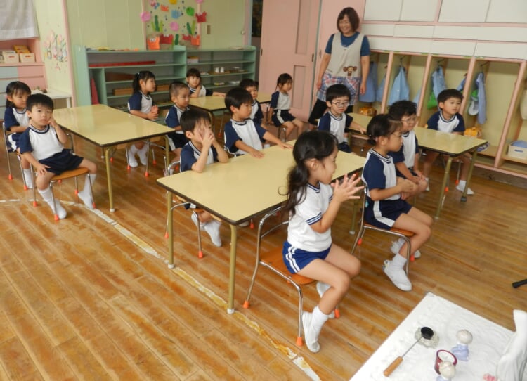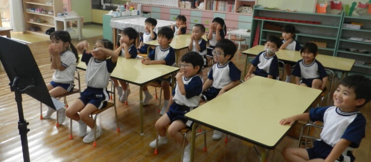 この日は 3番目(年少児)ふたば組(満三歳児)のリトミック指導の日でもありました。下にお写真を載せておりますが、2グループに分かれてご指導いただいております。