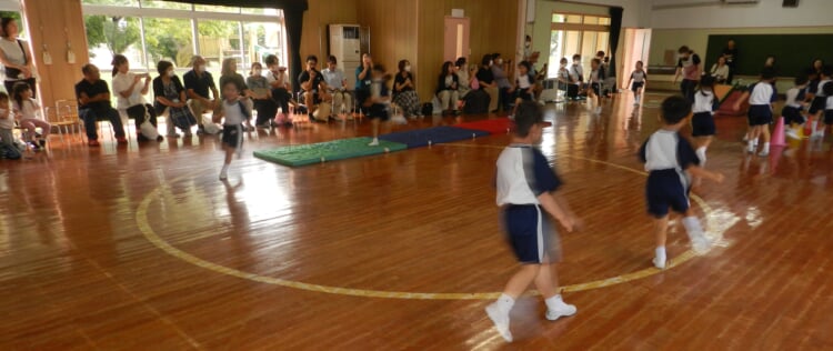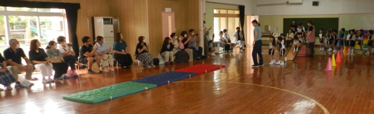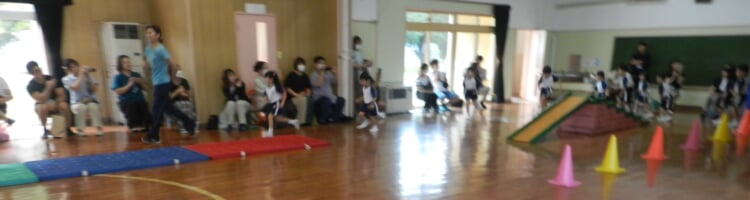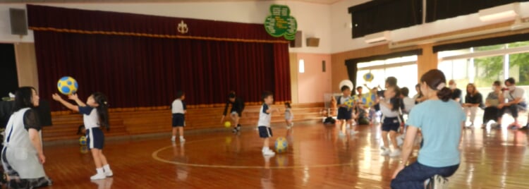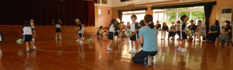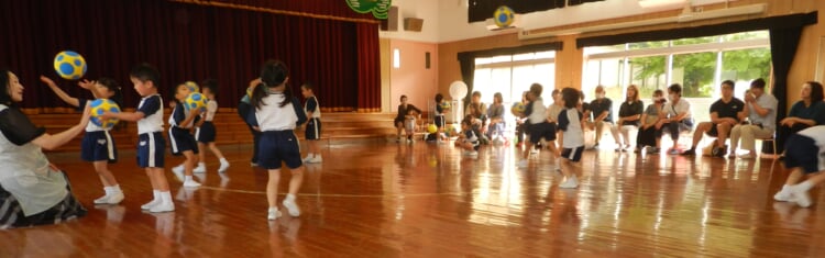 参観内容は、学院体育教諭による”体操指導”です。トップ画面は、ウォーミングアップ中の子ども達です。たっぷり身体を動かした後は、「縄跳び」と「ボール遊び」のご指導を受けました。