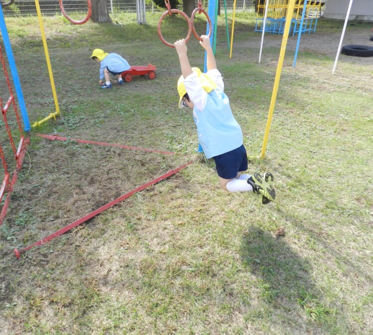 その後は、お庭遊びを楽しみました。大人気のワゴンや吊り輪で力試し中です!!