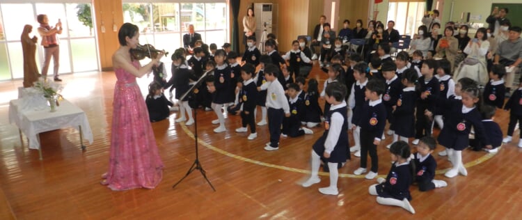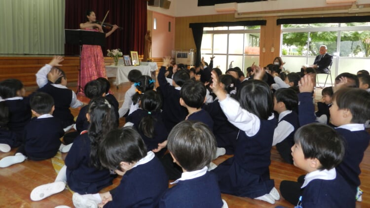 ヴァイオリンを弾きながら子ども達の間を歩いて下さり、時々しゃがみ込んでは、目の前で指使いを見せて下さいました。