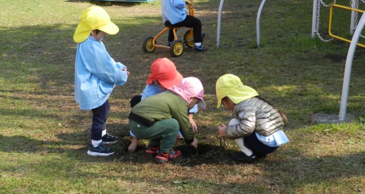 別の場所では、2歳児一時預かり利用のお友達も交えて、”モグラ”の痕跡を確認中なのでした。