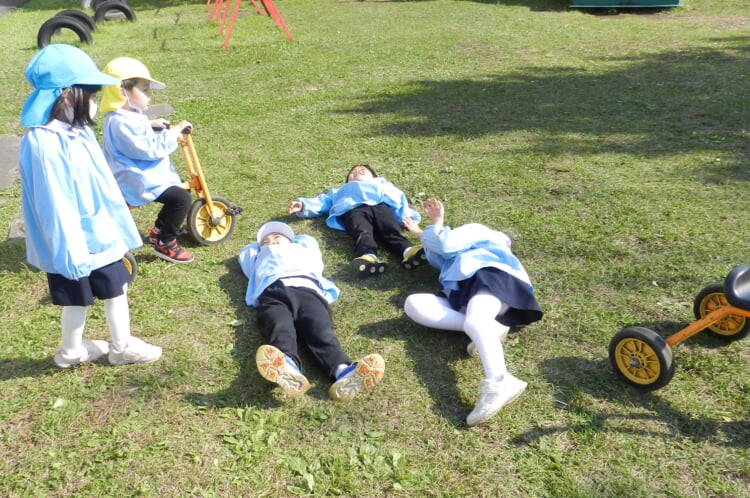 思いっきりお庭を走り回り、「うわぁ!!」と言いながら、草の上に寝転ぶお友達を発見!!「なにしてるの~?」とお友達が集まってきましたので、「お空がきれいで気持ちいいんだって。見て見たらどう?」と、園長先生の言葉に「えっ?寝てもいいの?!」と嬉しそうに寝転ぶお友達もパチリ!撮影しました。