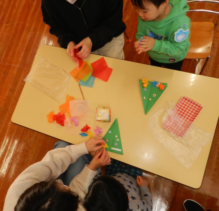 冬休みでしたので、普段参加出来ないクラス担任の先生方のおもてなしです。MIKI先生の楽しい手遊び、そして園長先生のウェルカムわらべ歌遊びの後は、お制作「クリスマスツリー」。みんなのツリーが出来上がり、ステージ階段に並ぶととても可愛らしかったです。