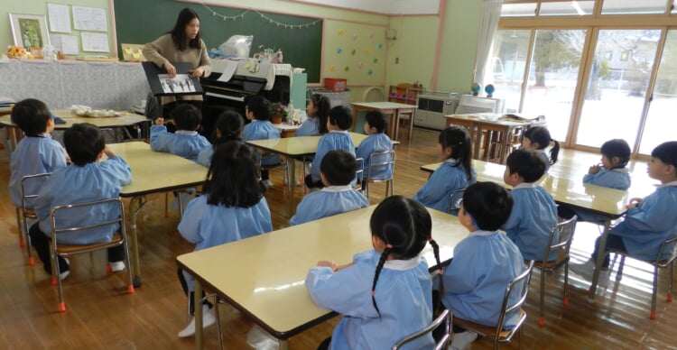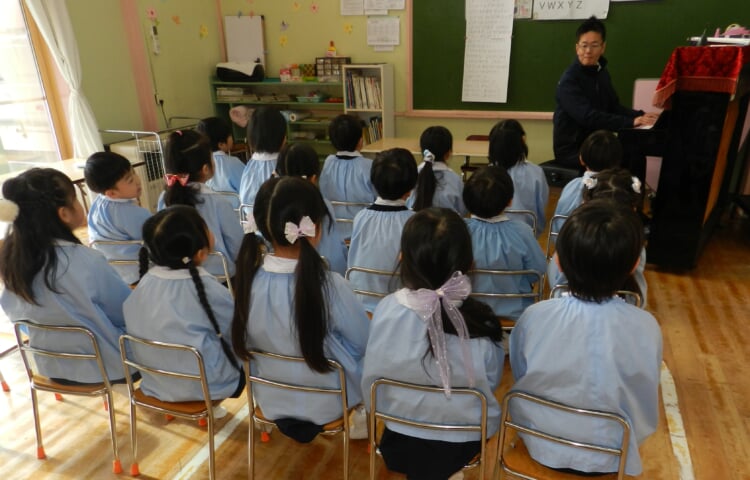 3学期初めての年齢別指導がありました。 1番目(年長児)さんはSEKINE先生の音感指導。 素敵な歌を歌っておりました。