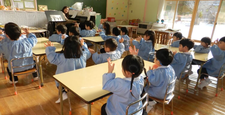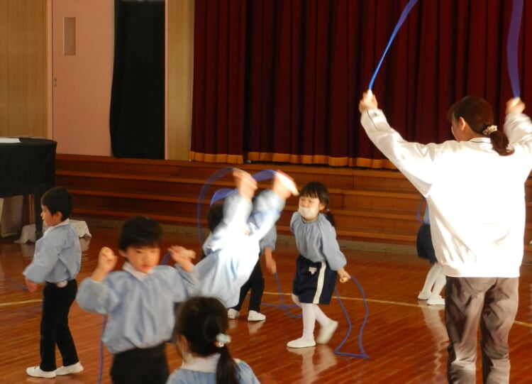3番目(年少児)・ふたば組(満三歳児)さんは、MATUNO先生によるリトミック指導。教材研究もされており、今回のリトミックもとても楽しくリズムを会得する内容でした!!