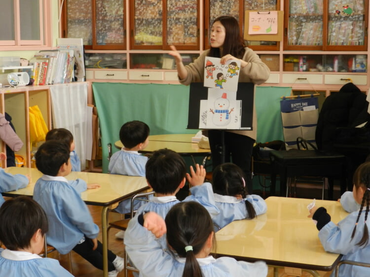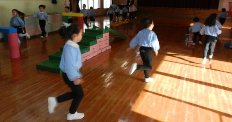 2番目(年中児)さんはTANDOU先生による体操指導。ウォーミングアップも工夫が凝らされており、お外は雪景色でもホールの中は熱々です。