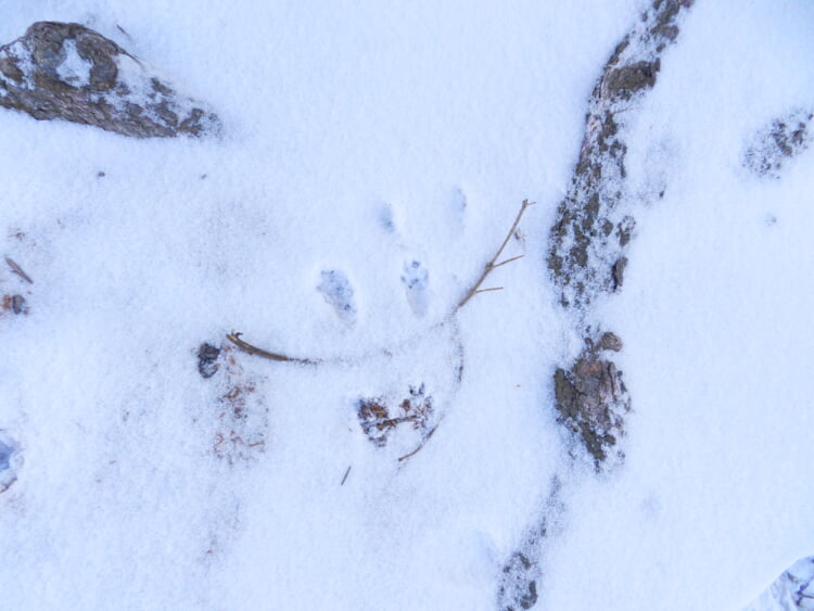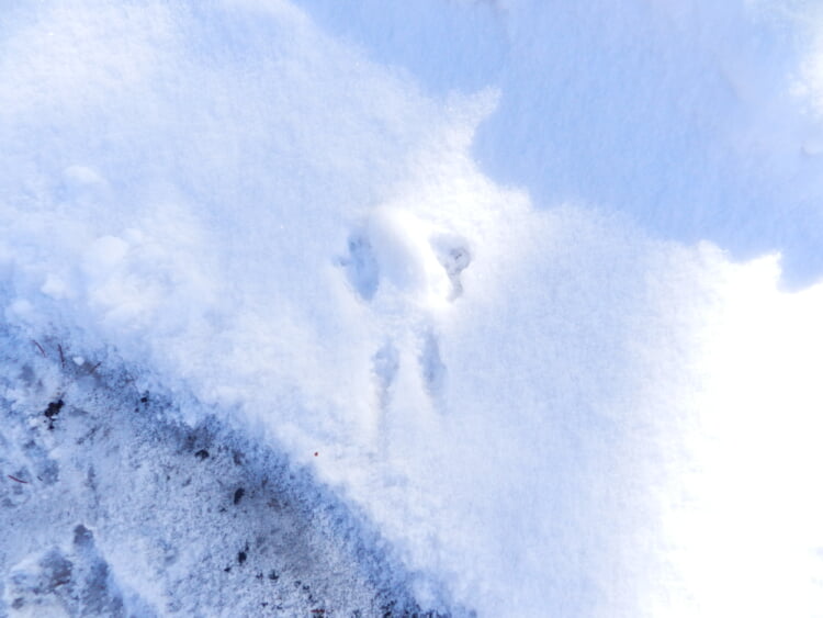 下のお写真は、ウルスラっ子りすさんの足跡です。 桜の木から離れた木へ、雪原をジャンプするように移動するリスさんの足跡が可愛らしく残っていました。
